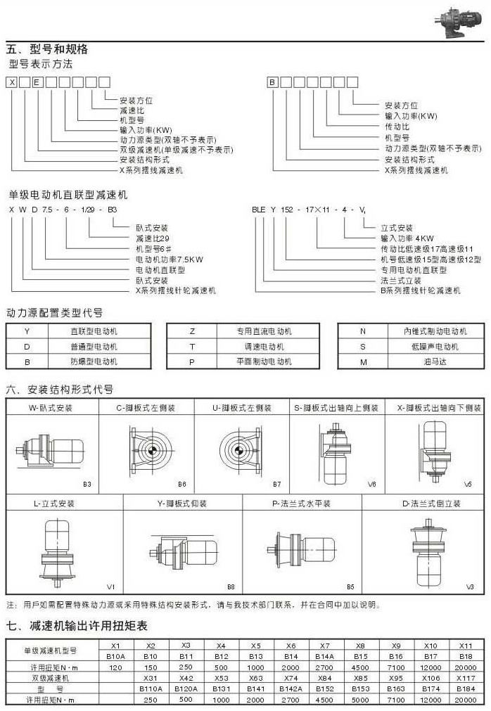 機型號和規格表示法安裝結構形式代號減速機輸出許用扭矩表