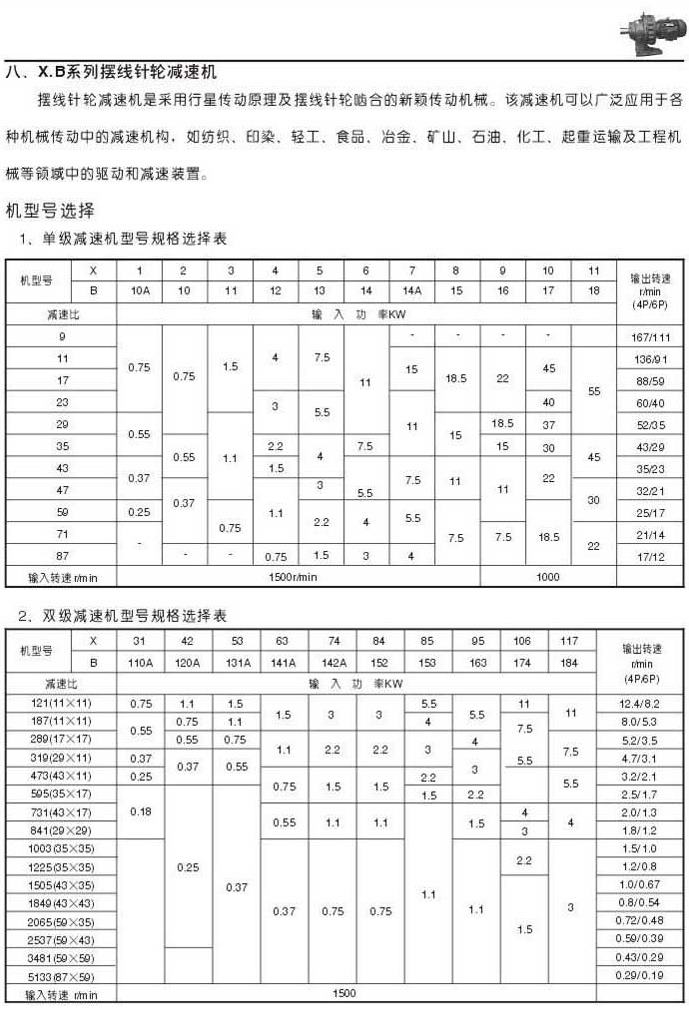 X . B擺線針輪減速機說明單級減速機型號規(guī)格選擇表雙級減速機型號規(guī)格選擇表